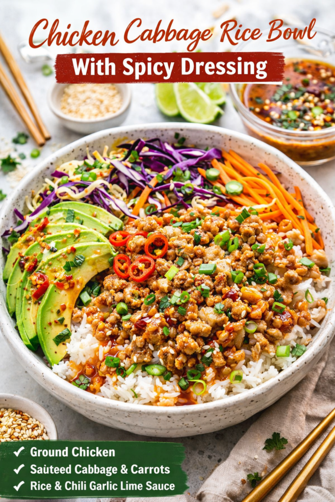 Thinly sliced cabbage adds freshness and crunch, while rice, cooked chicken, cucumber, herbs, and a spicy drizzle make the bowl feel complete.