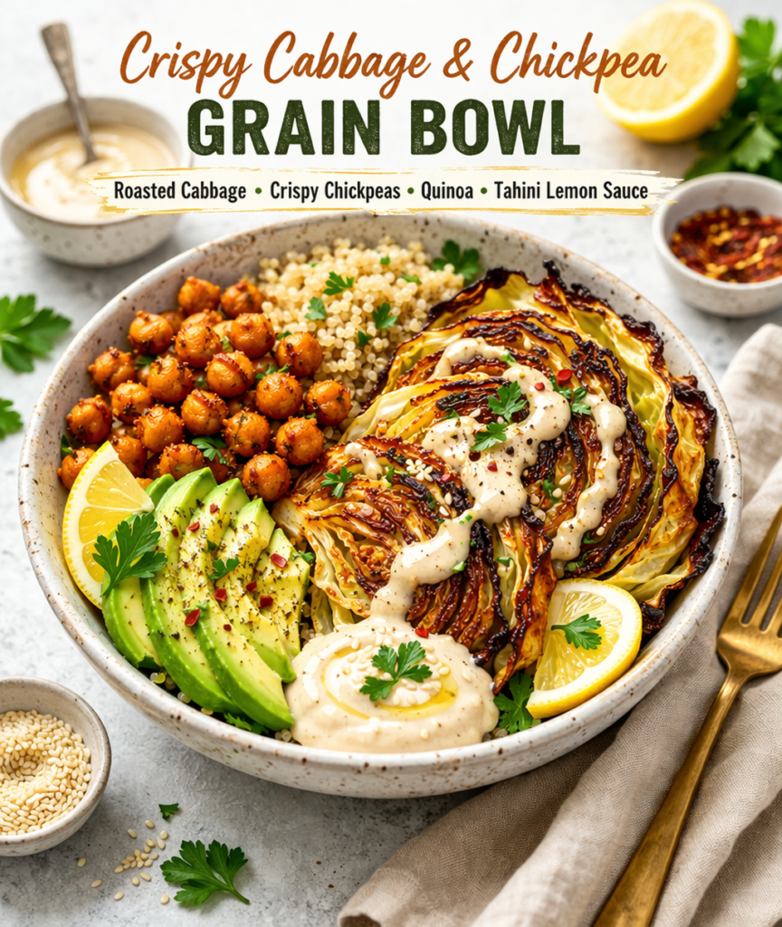 Roasted cabbage adds warmth and caramelized edges, while crispy chickpeas bring texture and protein.