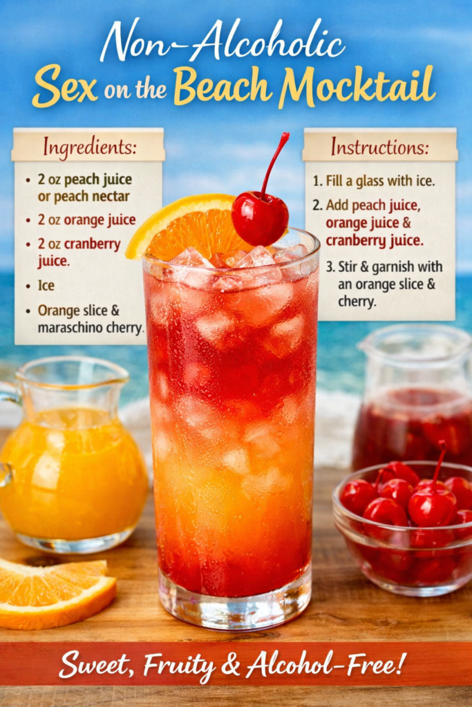 To make a non-alcoholic Sex on the Beach mocktail, you’ll need peach juice or peach nectar, orange juice, cranberry juice, and ice. For garnish, add an orange slice or maraschino cherry if you’d like.